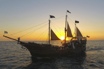 A bordo no sufrirás de hambre, ya que comerás el más energético de los desayunos y la más deliciosa comida, además de 6 horas de barra libre, fiesta y diversión. Nada iguala nuestro espectáculo pirata, la diversión, la aventura, las acrobacias y los efectos especiales están por doquier, haciéndote sentir libre antes de llegar a tierra firme.