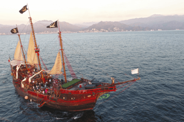Usted verá brillar las espadas en acrobáticas peleas entre piratas, descolgándose entre cuerdas, bombardeando al pueblo con sus cañones y haciendo explotar la pólvora bajo una lluvia de fuegos artificiales que lo harán sentir parte de este temerario espectáculo, navegando a bordo de un impresionante Galeón de más de 700 toneladas, donde comerá la más deliciosa cena del Puerto, disfrutará del atardecer, se refrescará con Barra Libre Nacional, Fiesta y entretenimiento al límite.